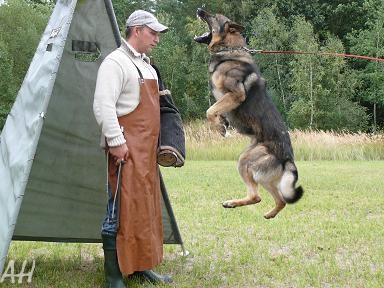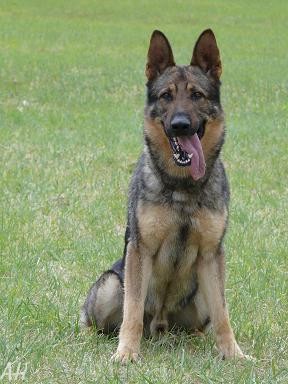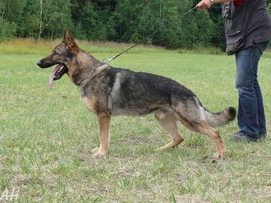 Mittelgroß, mittelkräftig, trocken und fest, gestreckt, guter Ausdruck. Guter Kopf, guter Widerrist, gerader Rücken, etwas kurze, abschüssige Kruppe, der Oberarm sollte länger sein und schräger liegen, gute Hinterhandwinkelungen, ausgeglichene Brustverhältnisse, korrekte Front und Schrittfolge. Sehr gute Gänge, wirksamer Nachschub, der Vortritt sollte freier sein. Sicheres Wesen, TSB ausgeprägt; läßt nicht ab. |